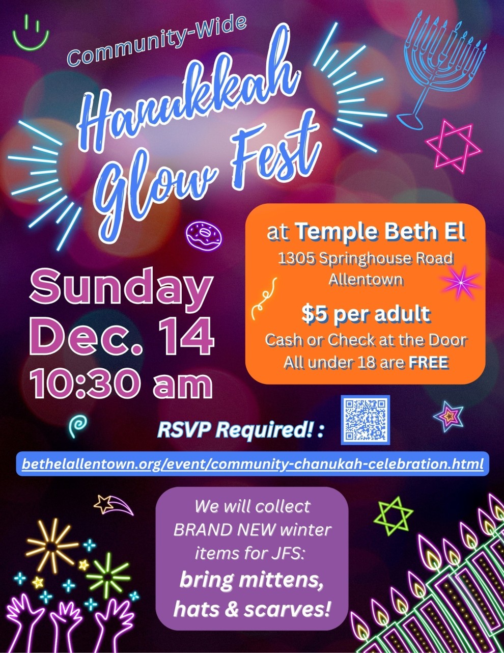 Join us for the Community-Wide Hanukkah Glow Fest at Temple Beth El.