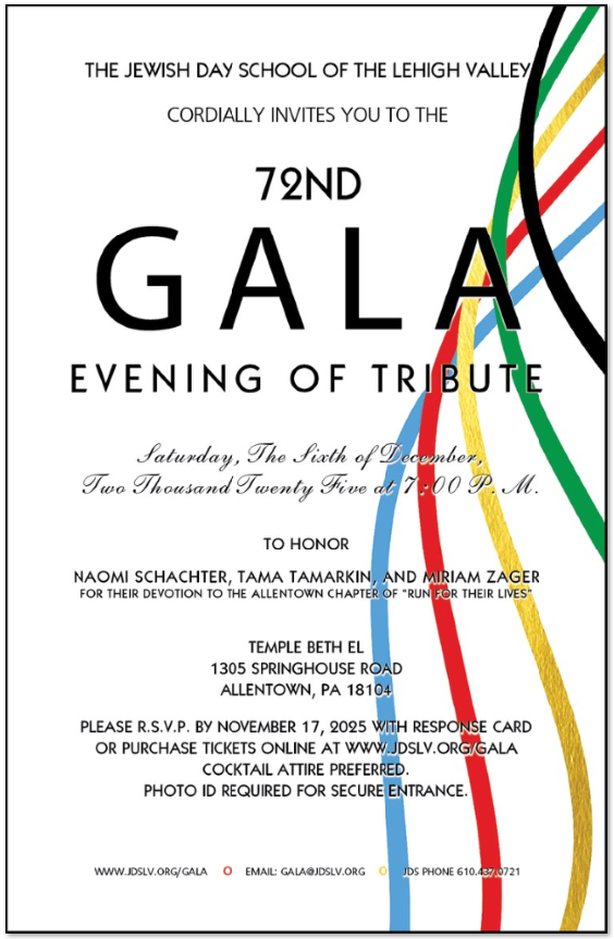 Visit jdslv.org/gala, email [email protected], or call 610-437-0721 for more information or to RSVP.