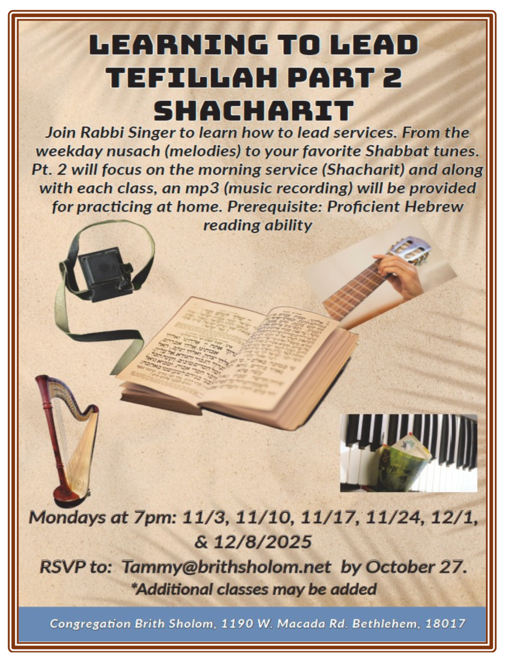 Join Rabbi Singer for 6 sessions to learn how to lead services. From the weekday nusach (melodies) to your favorite Shabbat tines. Part 2 will focus on the morning service (Shacharit) and along with each class, an mp3 (music recording) will be provided for practicing at home. Prerequisite: Proficient Hebrew reading ability. Classes are every Monday at 7pm: 11/3, 11/10, 11/17, 11/24, 12/1, & 12/8.