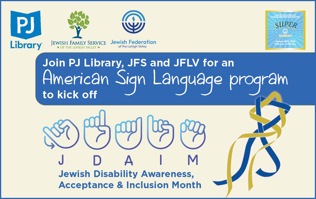 Please join PJ Library, Jewish Family Service and the Jewish Federation of the Lehigh Valley for an American Sign Language (ASL) program on Super Sunday to kick off Jewish Disability Awareness, Acceptance and Inclusion Month (JDAIM).