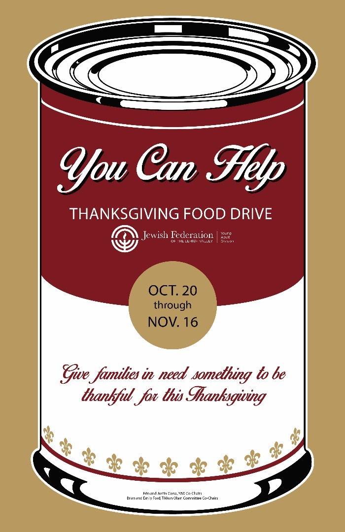 Jewish Federation Young Adult Division members and PJ Library families are invited to participate in the culmination of a month-long tikkun olam initiative to collect food and other items for the Jewish Family Service Food Pantry prior to Thanksgiving.