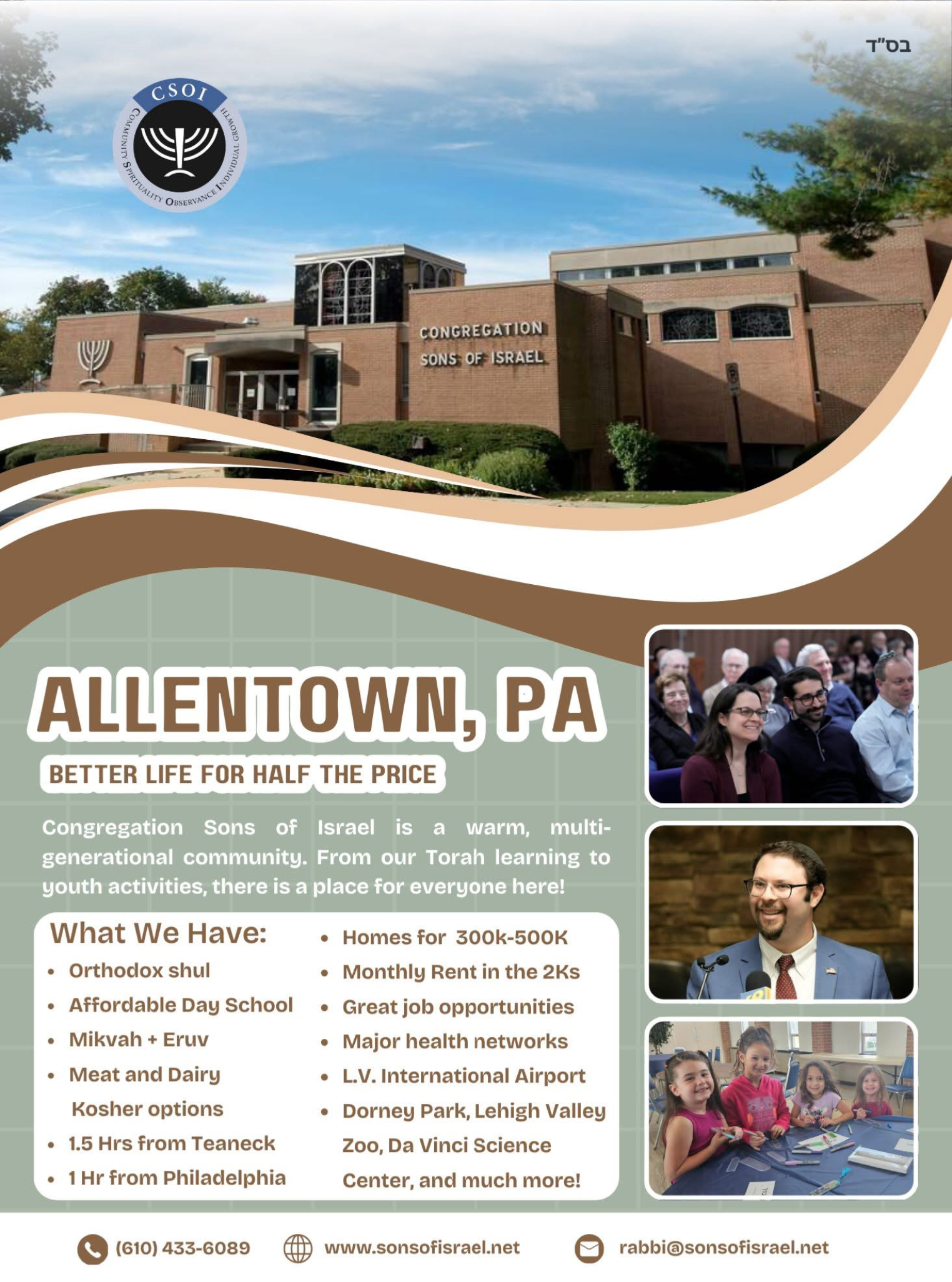 Sons of Israel is a warm and welcoming modern Orthodox synagogue that serves the entire Lehigh Valley community. The congregation fosters an atmosphere of spirituality, observance, and individual growth. It is the only synagogue in the region to offer daily morning and evening minyans. A broad spectrum of educational programs appears on its calendar, and it supports a strong chesed (kindness) committee with a mission to invite every Jewish person to worship, study, and participate in the community.